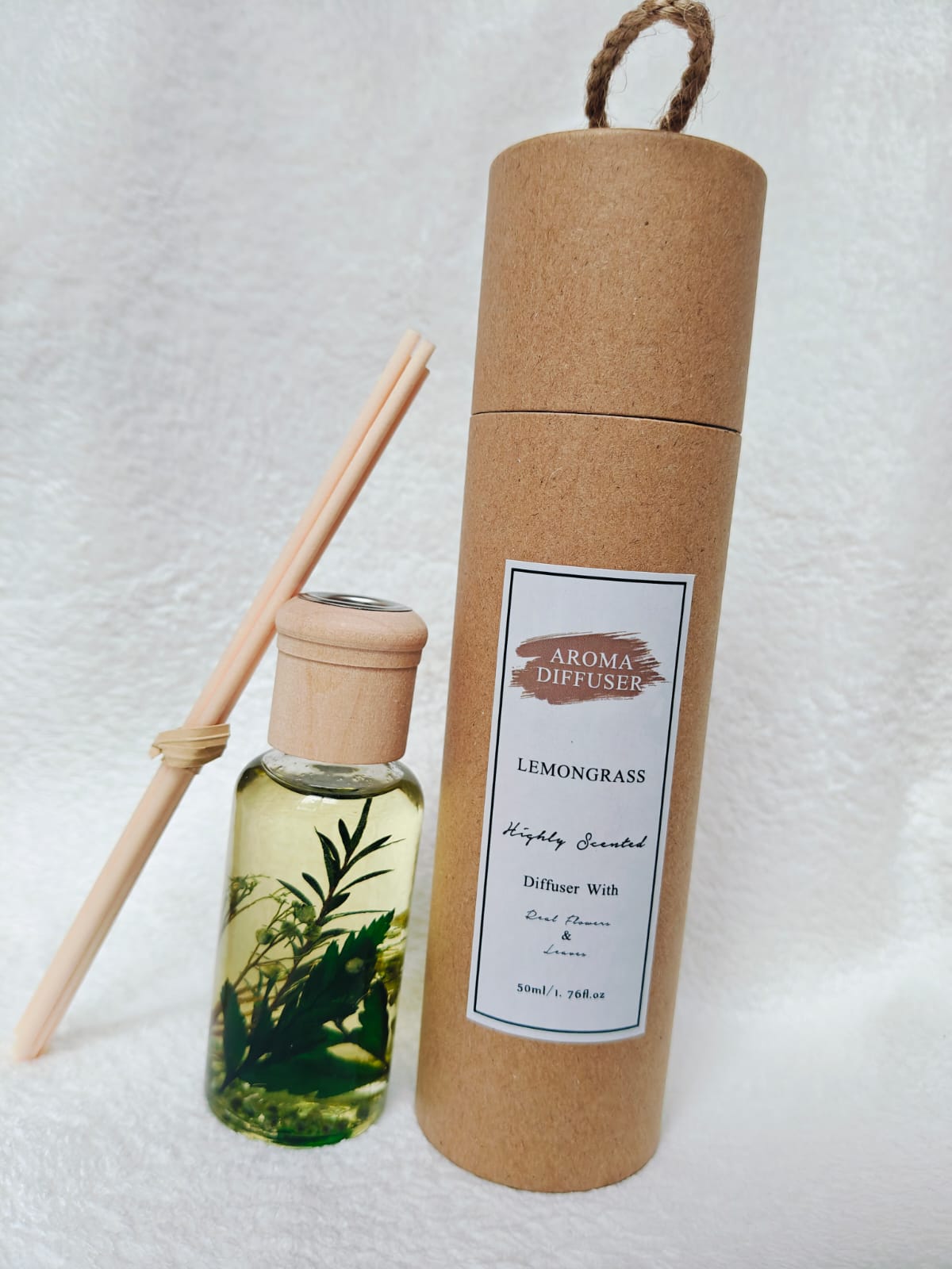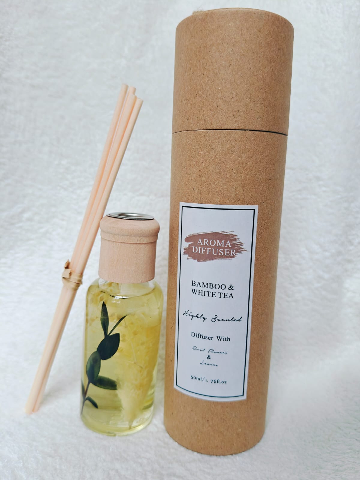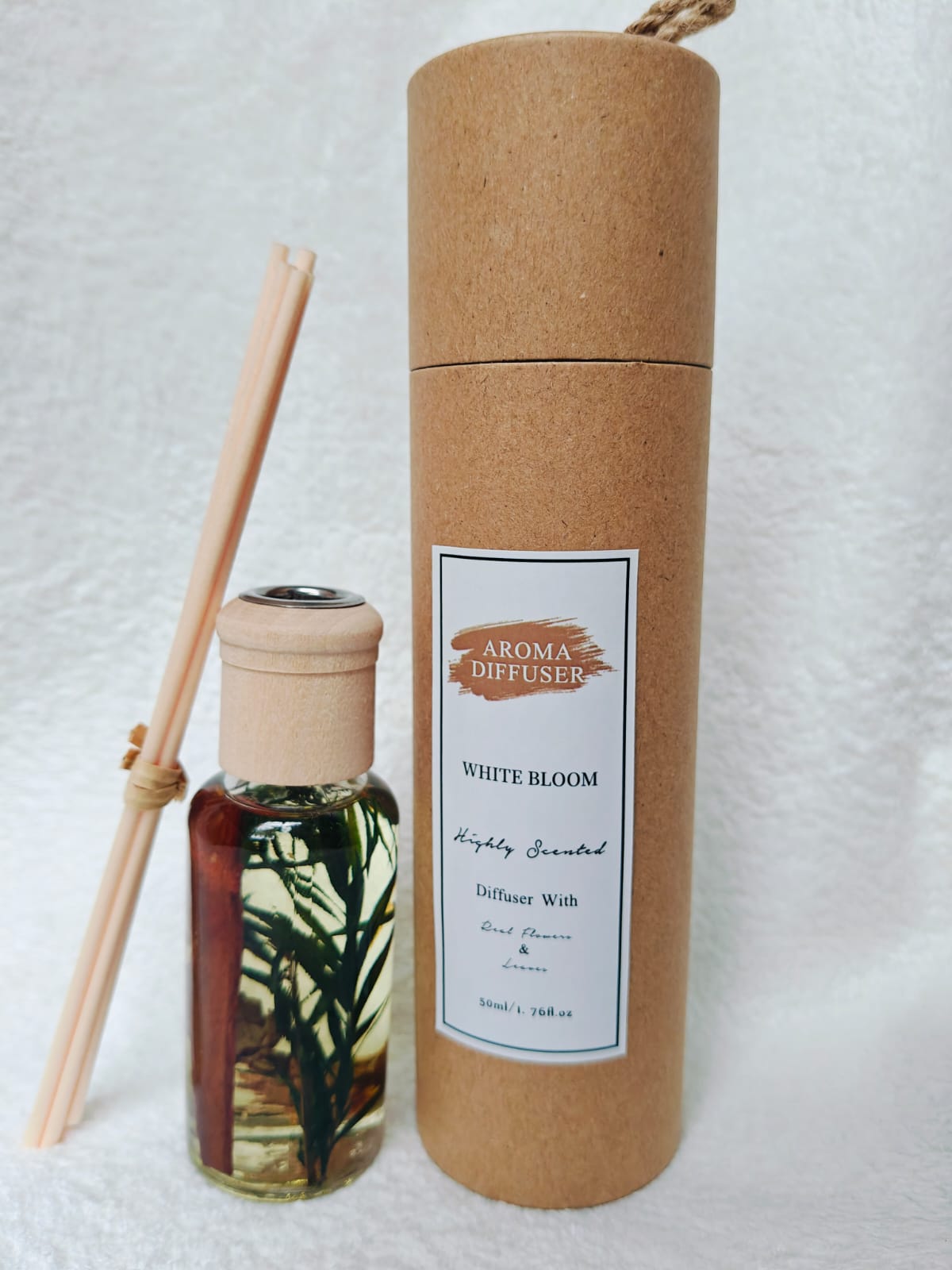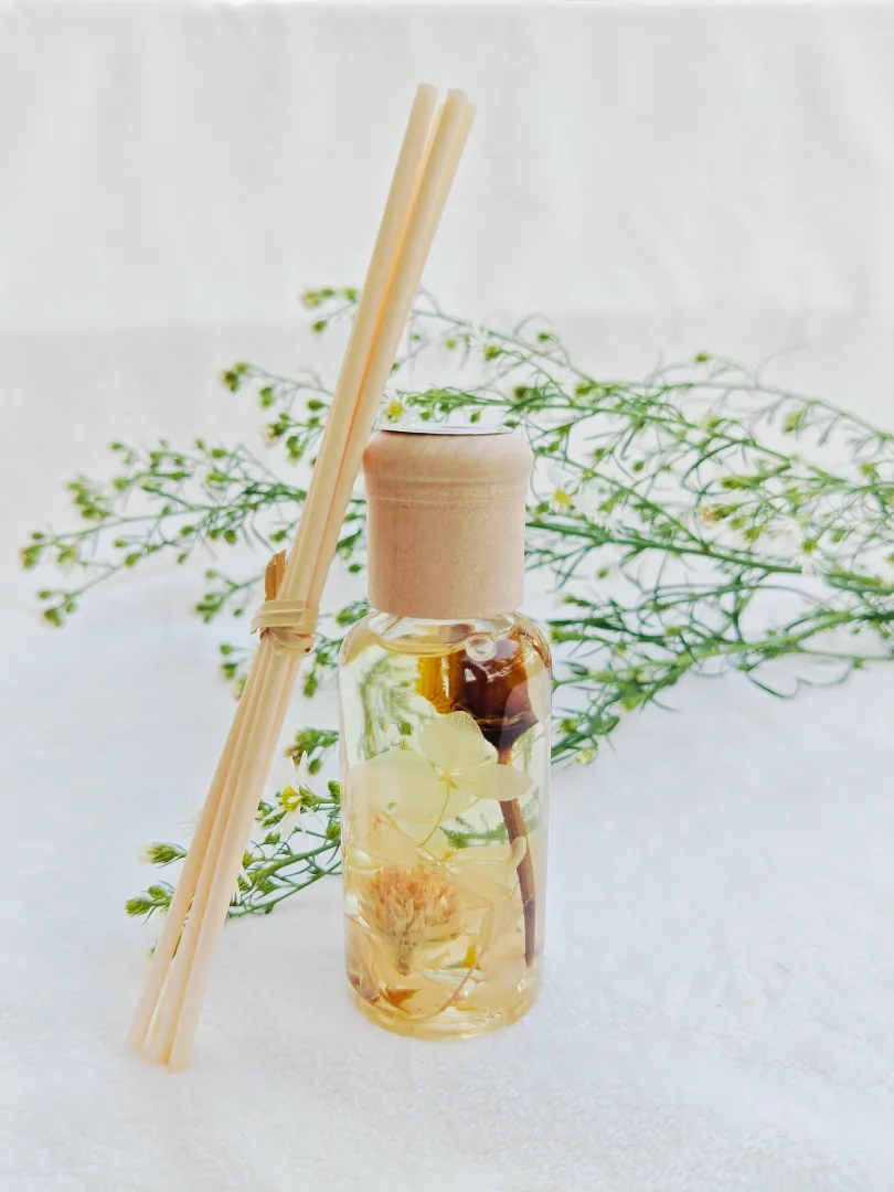 Scented Bliss Nature reed diffuser with dried flowers contains 50ml of aroma in a decorated glass bottle with wooden lid