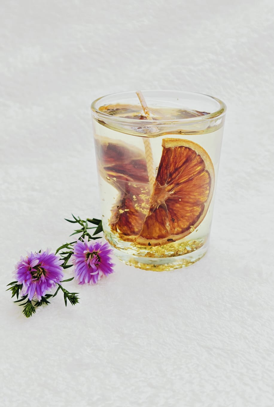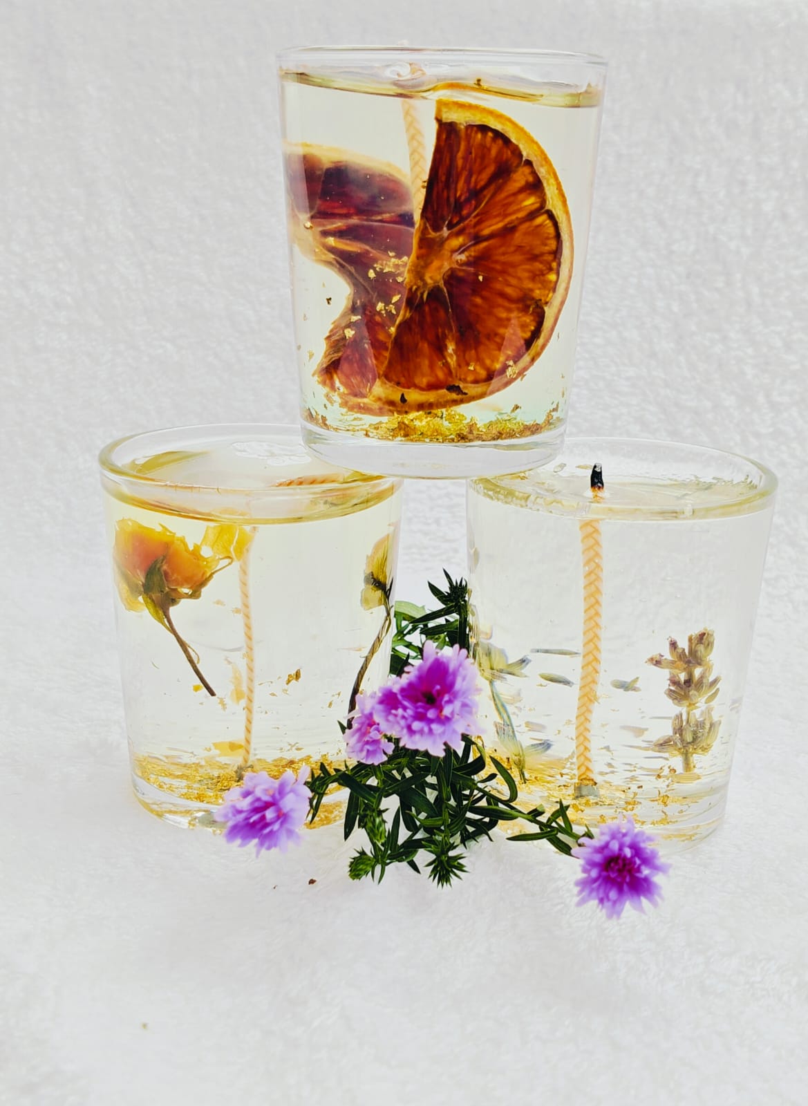 These artisanal scented gel candles are a stunning visual and aromatic experience. Crafted with clear, long-burning gel wax, they beautifully showcase suspended dried botanicals, fruit slices, and shimmering gold flecks. The transparent design magnifies the natural inclusions, releasing a delightful fragrance as they burn to create a uniquely decorative and enchanting glow for any space.